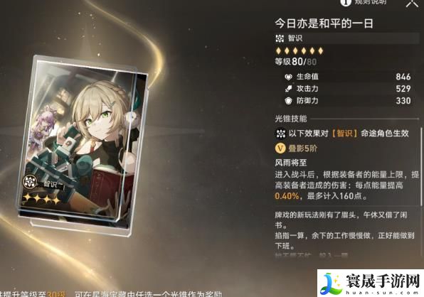 精1/5提供10/20%的攻击力或12/24%的暴击伤害或6/12%的能量恢复效率,虽然看着数值比较低,但这个光锥提供的是全队buff,虽说有不确定性,但基本上每个效果都有作用(对全队来说),即使是充能也能为队伍DPR(平均轮次输出)提供加成
