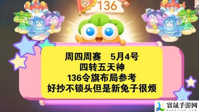 保卫萝卜4周赛5月4日的主角当然是鱼刺和手电筒,开局我们在左边放一个鱼刺用来打钱袋,右边放一个手电筒升三防守,后期我们再手电筒和鱼刺的配合下实现快速清图,然后进行适当的防守就可以轻松通关了!