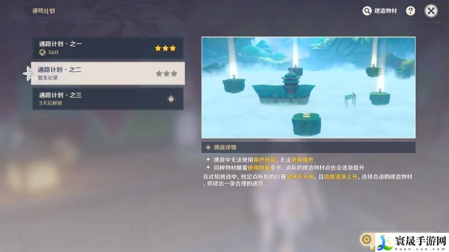 1、在「通路计划」中,需要在「建造模式」花费建造物材点搭建通路,并在「试行模式」中测试搭建的通路,从指定的起始点开始,以任意顺序到达所有检定点;
