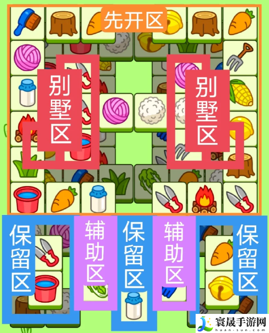一个方型大别墅,两个3+3叠牌别墅。开局先消除橙**。然后按照一层层均匀消除表面牌。哪里压牌比较多就先消除哪里。必要时可以用盲盒区辅助消除表面牌。尽量还是以别墅区互相消除为生。蓝**有叠牌,但是不多,全部保留到后期使用。
