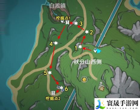 总览图:秋分山西侧(玩家可以跟随路线行走到达获得)
