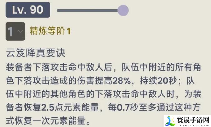 进行下落攻击时目标命中后,将提高全队中的角色下落攻击伤害,其他的角色下落攻击击中敌人时,还可以恢复装备者的元素能量。