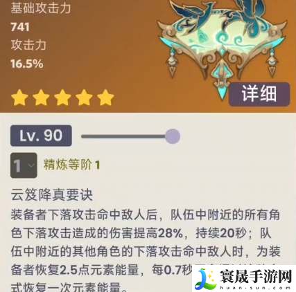 武器特效“云笈降真要诀”:装备者下落攻击命中敌人后,队伍中附近的所有角色下落攻击造成的伤害提高28%,持续20秒:队伍中附近的其他角色的下落攻击命中敌人时,为装备者恢复2.5点元素能量,每0.7秒至多通过这种方式复一次元素能量。