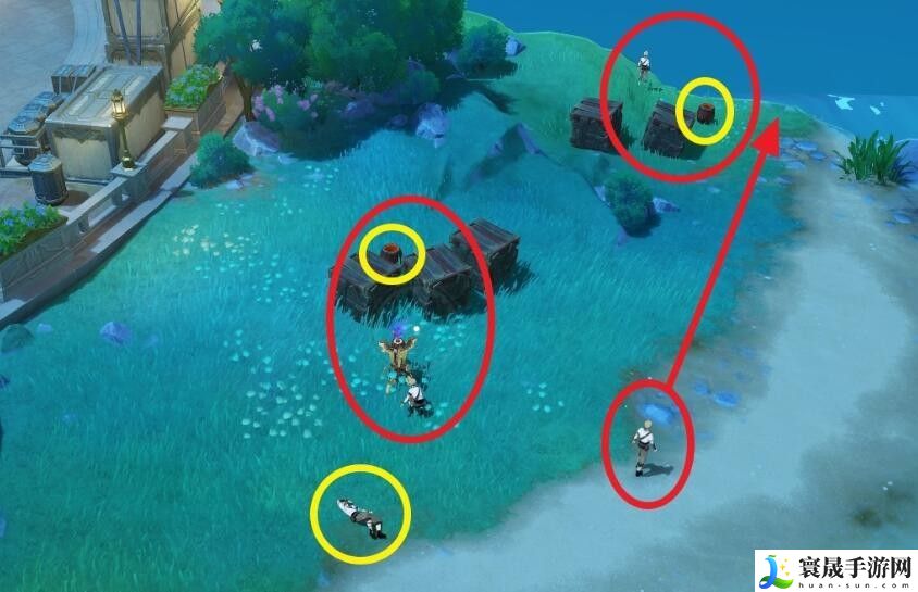 3、接着我们在图中左上角等待连个巡逻怪靠近引爆火药桶。