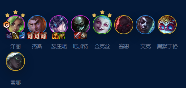 4-1升7人口,补出泽丽开4枪。鳄鱼换猪妹。5-1升8人口,补出厄加特开4祖安,塞纳换小炮,塞恩换猪妹。9人口后大头换蔚,再补出猪妹即可。