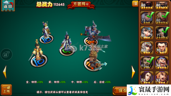 该阵容特点持久输出较高,副本群怪比较不错,还有一个特点是便宜,无须VIP即可获得全部武将,升星也是最简单的。前期是相当不错的阵容,后期非常疲软。