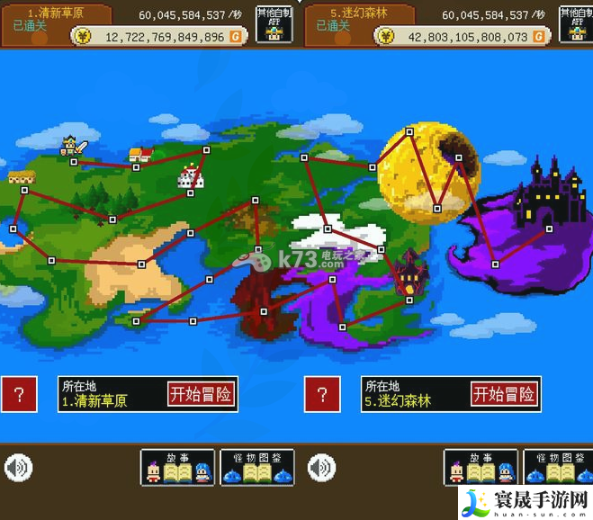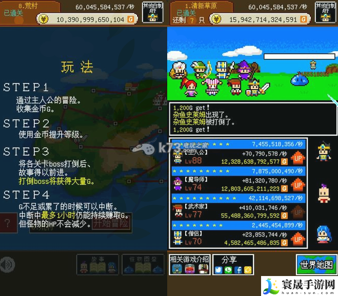 这游戏属于放置类游戏,点下 开始冒险 ,主人公便会纠集起一群人开始探索,并自动消灭怪物。而唯一要做的就是,利用杀怪获得的金钱(G),升级人物攻击力或解锁新的人物。同时金钱也会随着时间的推移自然增长,并持续1个小时左右。而一个区域被探索完后,便会开放该区域的剧情。