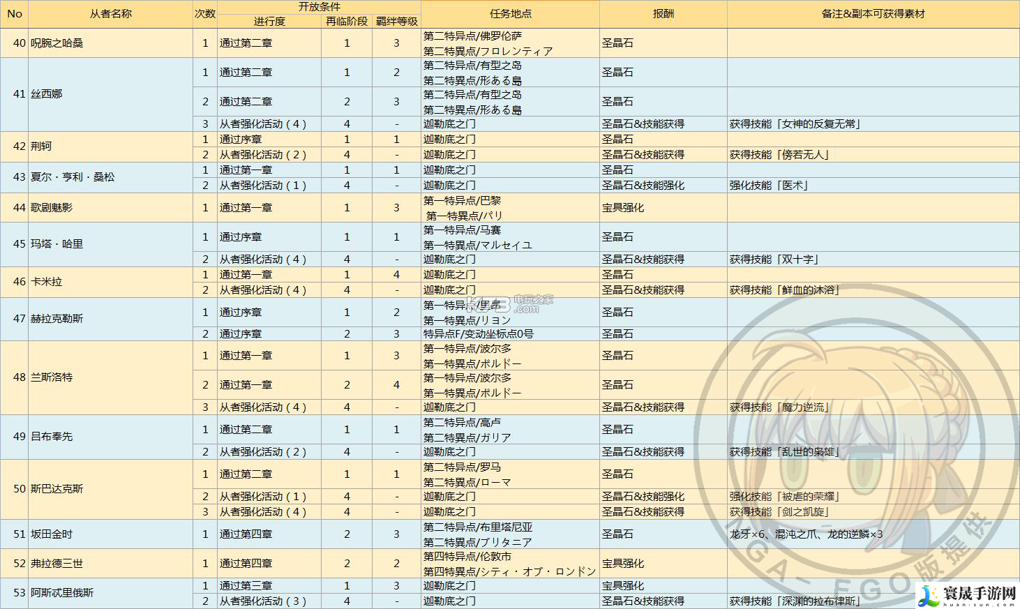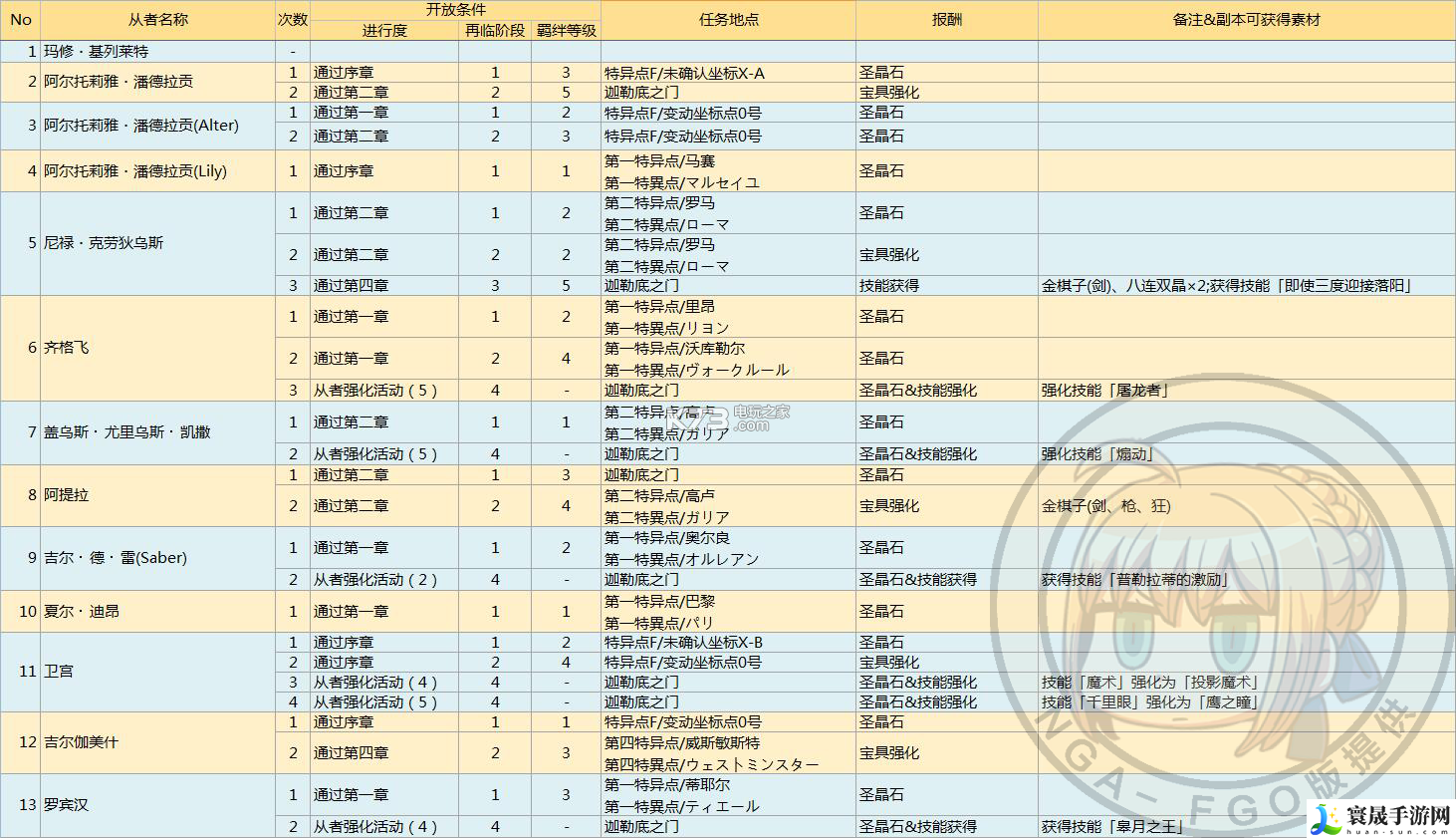 PS2.本表格是根据日服进度来做的 如果国服玩家发现达成了条件却找不到副本 可能是国服还没开放