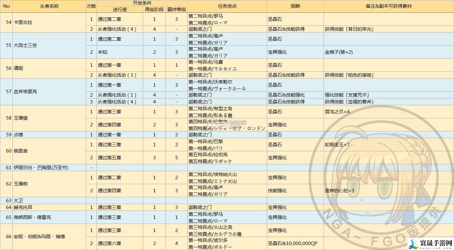 PS4.有部分从者的强化本详细开启方式暂时未知 欢迎各位补充 以后会及时更新该表格