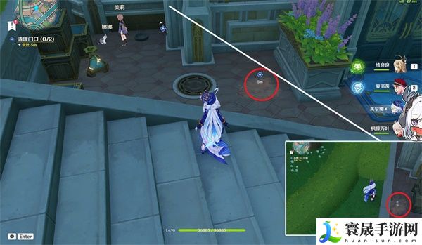 2、接着就可以来到房子旁边的位置,利用水/风元素进行污渍的清理。