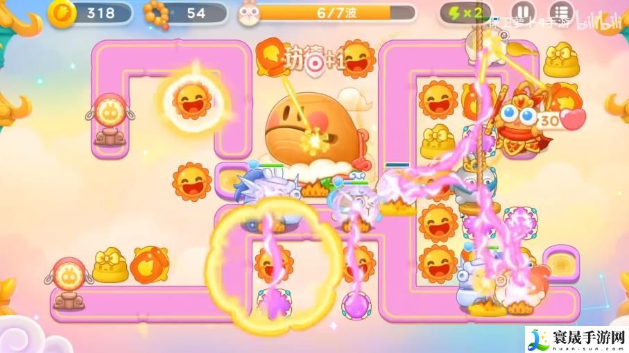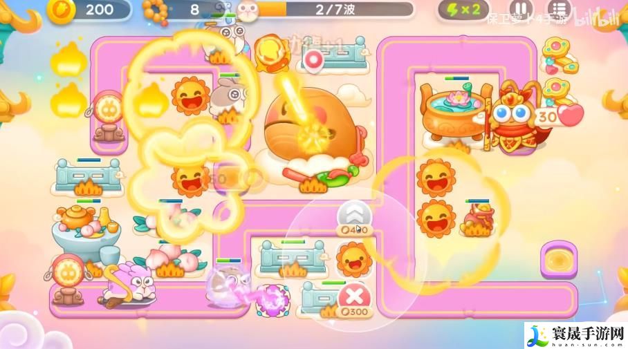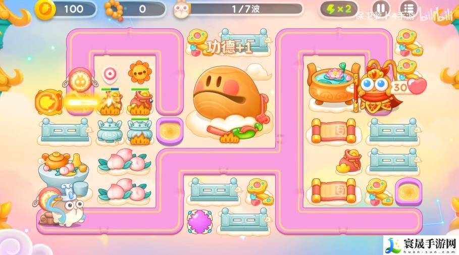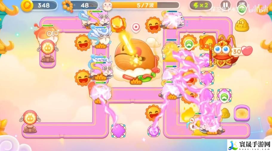保卫萝卜4周赛8.29开局我们在左则放置一个火瓶在中间下方放置一个魔法球这样前期基本上就可以守住,后面我们再增加太阳花,在做好防守后我们可以看到中间的木鱼一直给兔兔们加功德,我们需要用火瓶将其打掉!