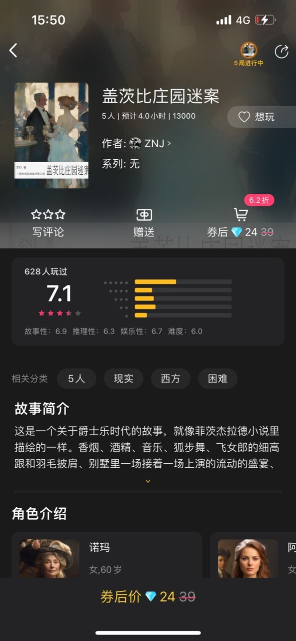 百变大侦探盖茨比庄园谜案为我们带来的是一个关于爵士乐时代的故事,这个5人简单剧本任务中我们要找出谁才是真正的凶手,在这次的不眠宴会上发生了很多离奇的事件,我们通