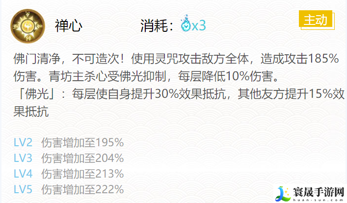 青坊主对阵容的适应性强,搭配幽谷响走辅助,兼具输出,队友可以得到一层佛光,配合被动技能,有很高抵抗率。