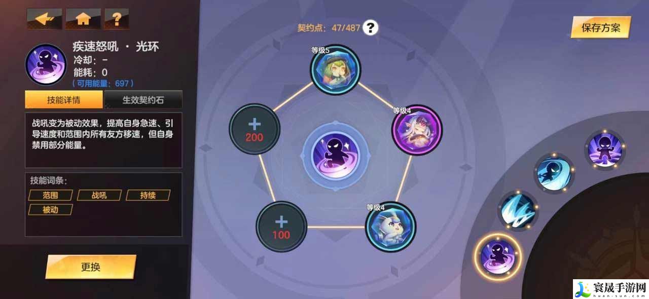 点击技能可查看技能介绍以及进行契约石搭配。共有4个技能槽,36个技能,每个技能可携带五枚契约石,需通过提升契约点来装备更多的契约石,提升战力。前期建议集中投入资源哟,例如在契约石和技能搭配上,选择出主技能。