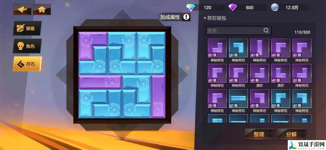 “背包”中左侧按钮可切换“装备”“角色”,等级提高后还会增加“符石”页,提升等级解锁符石,迎来新的增强神器,装备上不同属性的符石,加强对应的属性来提升综合战力。