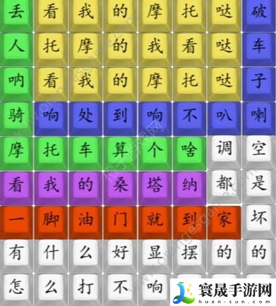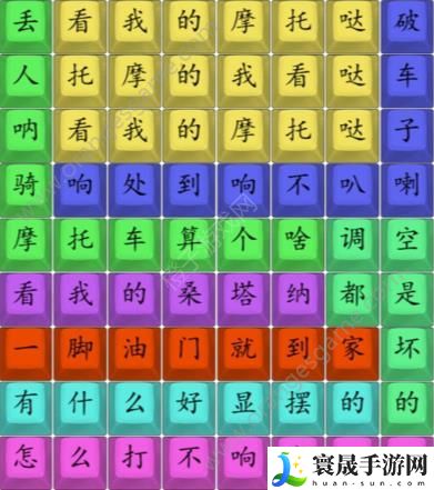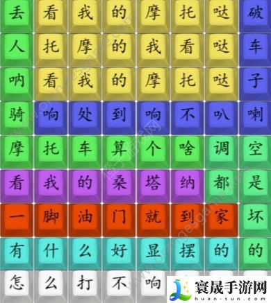 汉字找茬王连印式摩托车要怎么连线才能得出正确答案呢,其实这一关最难的还是第一句,如果前面连对了后面也没有什么难度可言,我们还可以一边听美妙的音乐一边完成关卡挑战,看我新买的摩托车,哒哒哒吧!
