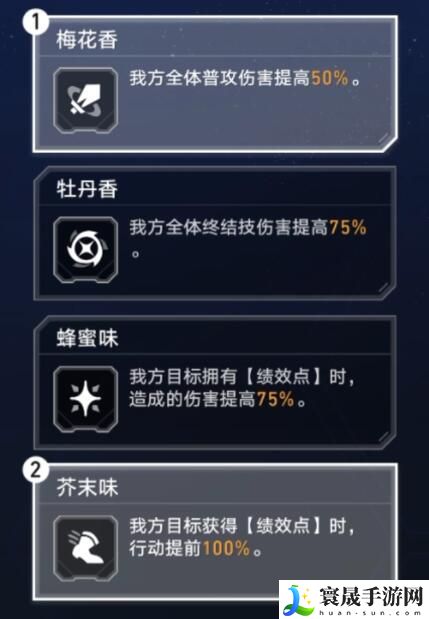 解析:梅花香提高了队伍的普攻伤害,可以提高队伍的斩杀线。芥末味可以在夺取绩效点之后提升全队的行动条,让你可以更好的进行输出。