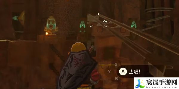 3、一直往前走,使用弓箭击中对面的机关,轨道会改变成向上。