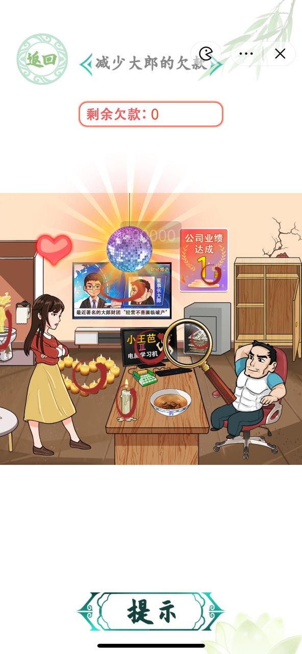 好了,这次我们成功帮大郎还清欠款了,我们只需要按上面的提示来选就可以了!