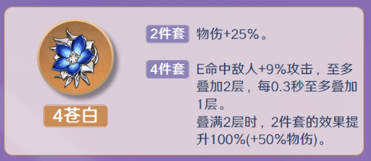 推荐理由:4苍白比4角斗多15%物伤,但有启动条件(需E命中敌人两次,EQE可瞬间启动),不过难度不高,对伤害有和追求的小伙伴看考虑。