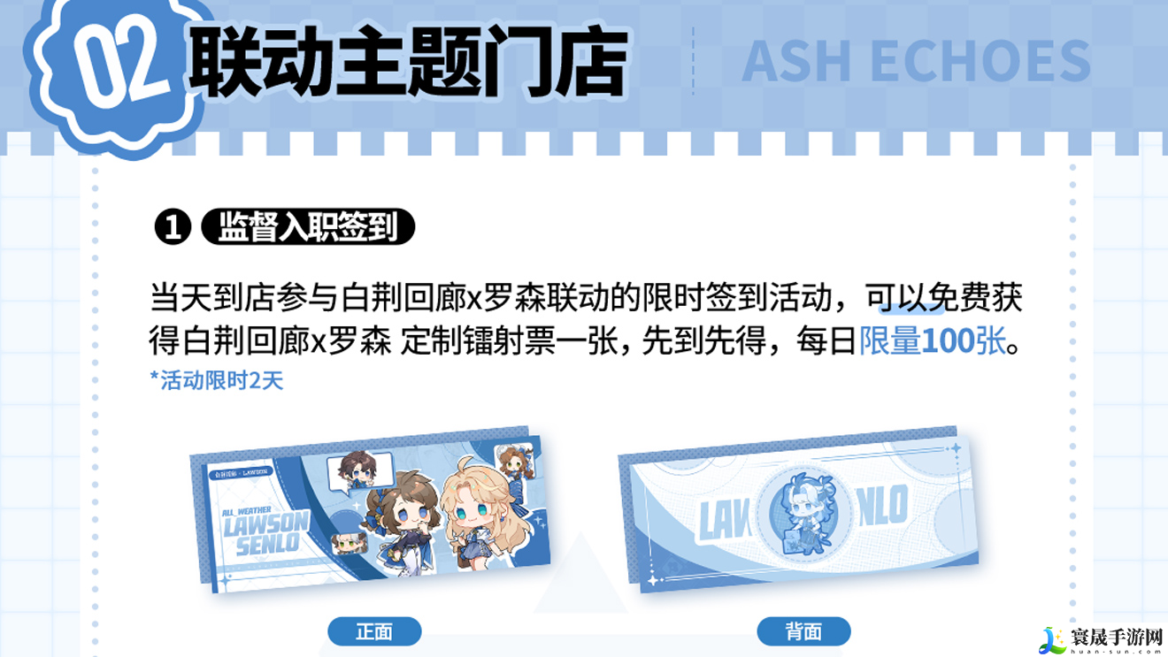 指定活动日内,《白荆回廊》特邀高颜值Coser出任「一日店长」,空降成都、深圳、上海等主题门店为大家服务!届时监督可前往相应店铺与「一日店长」及一众角色近距离合照互动,同时,消费满50元即可参与周边抽奖,完成入职签到活动还能免费获得【白荆回廊x罗森定制镭射票】。快乐不仅于此,前往任意主题门店拍照打卡,并在指定社交平台带话题分享相应内容,即有机会成为超级幸运锦鲤,获得官方抽选送出的【全套罗森联动周边】,奖励数量有限,先到先得!