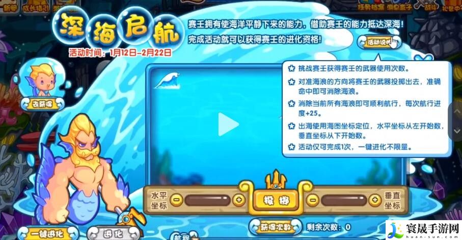 1、洛克王国深海启航活动是需要挑战塞壬,获得投掷次数,从而将界面中的海浪平静下来,将界面的所有海浪平息后就可以获得25的航行进度。