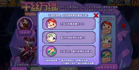 4、洛克王国千丝万缕动右侧有三只宠物,小洛克们可以邀请其进行协助,完成后可以查看协助效果。每天有三次结网的机会,根据协助效果,结网进度可能有所不同,每次结网需要等待三分钟哦。累计获得100点结网进度,就可以开启:伊莎贝拉超进化啦。