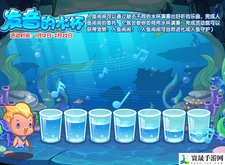 人鱼闹闹可以通过敲击不同的水杯演奏出好听的乐曲,完成人鱼闹闹的委托,它就会教你如何用水杯演奏!完成活动就可以获得宠物:人鱼闹闹!(人鱼闹闹可自然进化成人鱼守护)