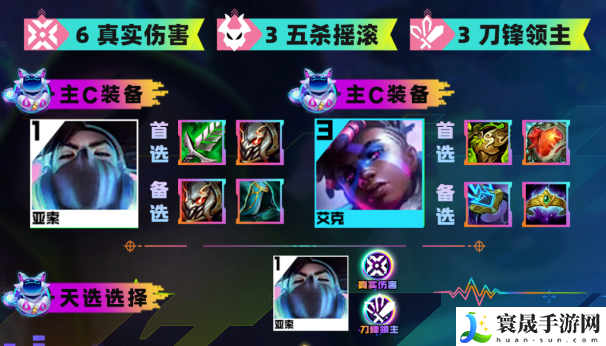 2、阵容羁绊:6真实伤害3五杀摇滚3刀锋领主2秘术卫士1双修出道
