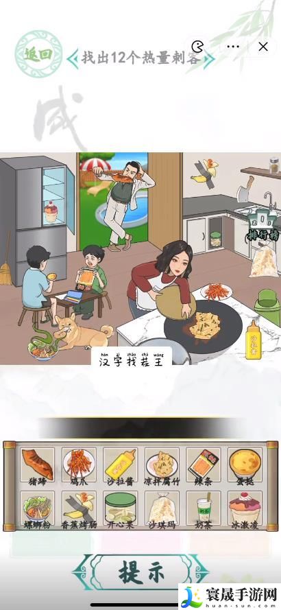 汉字找茬王找出12个热量刺客需要我们用最快的速度找到这个家庭里含有高热量的食物,其实这个大多数我们还是能轻易找到的,但要一下子找齐12处还是有些考验人眼力的,下