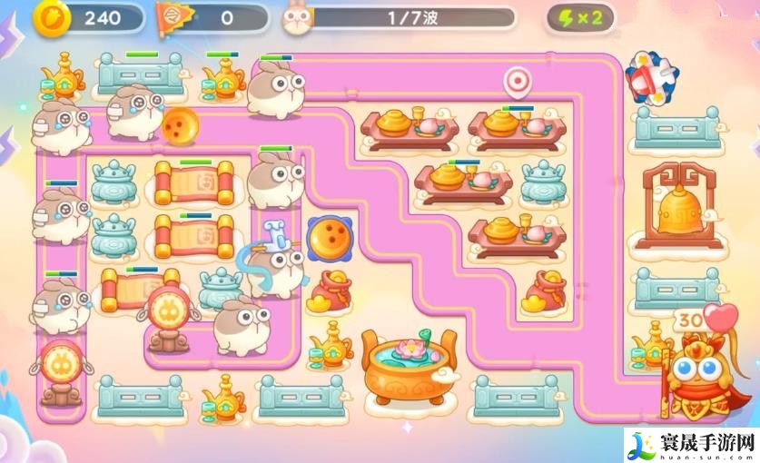 1、开局右上布局一个飞机用来打木桌,等兔子来了中间布局一个二级保龄球