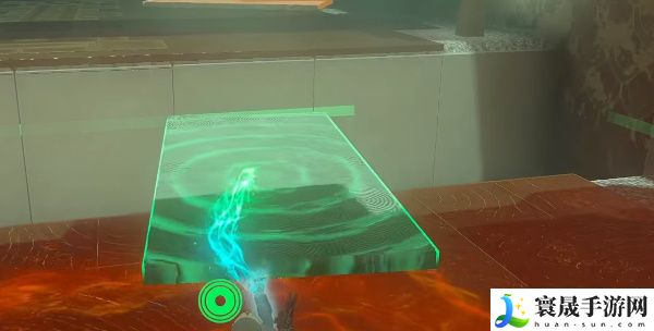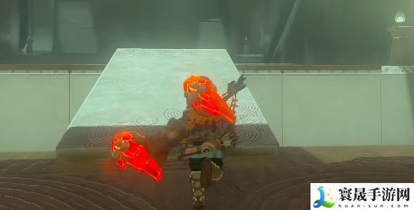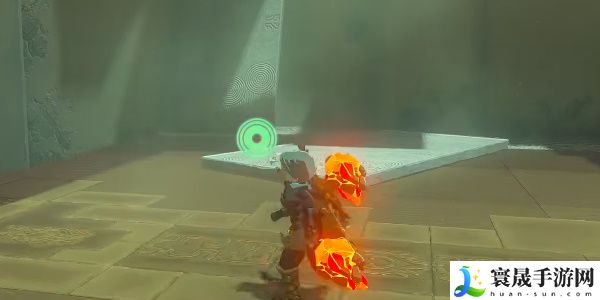 1、进入神庙后一直往里走,找到下图砖块以后使用【究极手】,将它搭在两个平台中央。