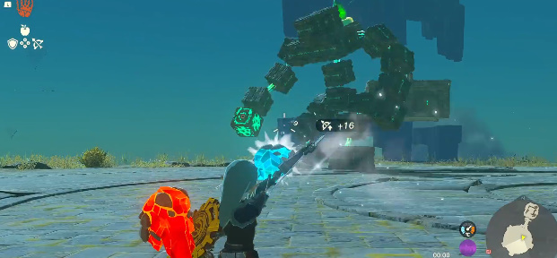 1、首先来到北海拉鲁天空诸岛这位置,到达之后,往前面走选择附加在箭上的材料击败方块魔像;