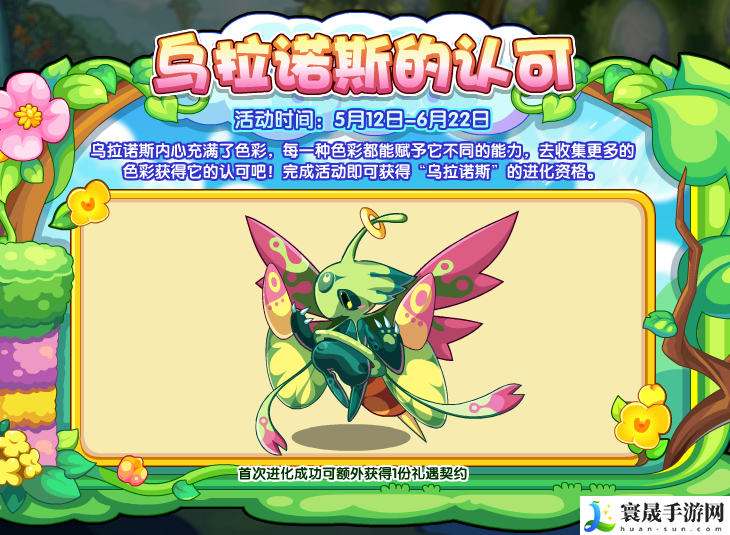 乌拉诺斯内心充满了色彩,每一种色彩都能赋予它不同的能力,去收集更多的色彩获得它的认可吧!完成活动即可获得“乌拉诺斯”的进化资格。