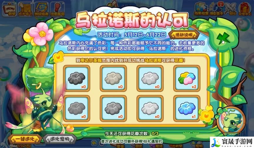 3、累计收集八中花色各一瓣即可获得:乌拉诺斯进化资格。