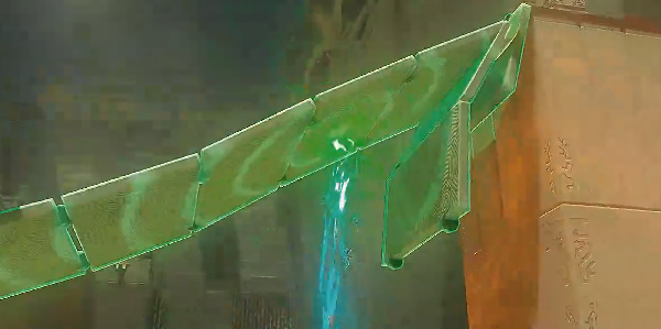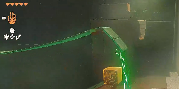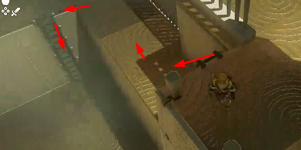 1、进入神庙后沿着道路一直往前走,在下图位置使用【究极手】,将底部的断桥与下图位置连接。