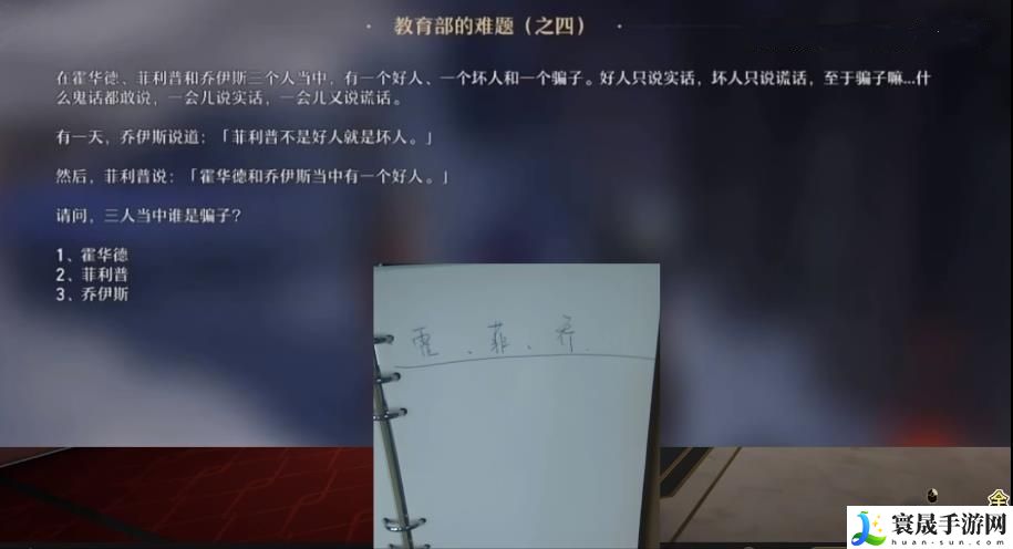 在霍华德,菲利普和乔伊斯三个人当中。有一个好人。一个坏人和一个**。好人只说实话,坏人只说谎话,至于**嘛..什么鬼话都敢说,一会儿说实话。-会儿又说谎话。有一天,乔伊斯说道:菲利曾不是好人就是坏人。然后,非利普说:霍华德和弄伊断当中有一个好人。
