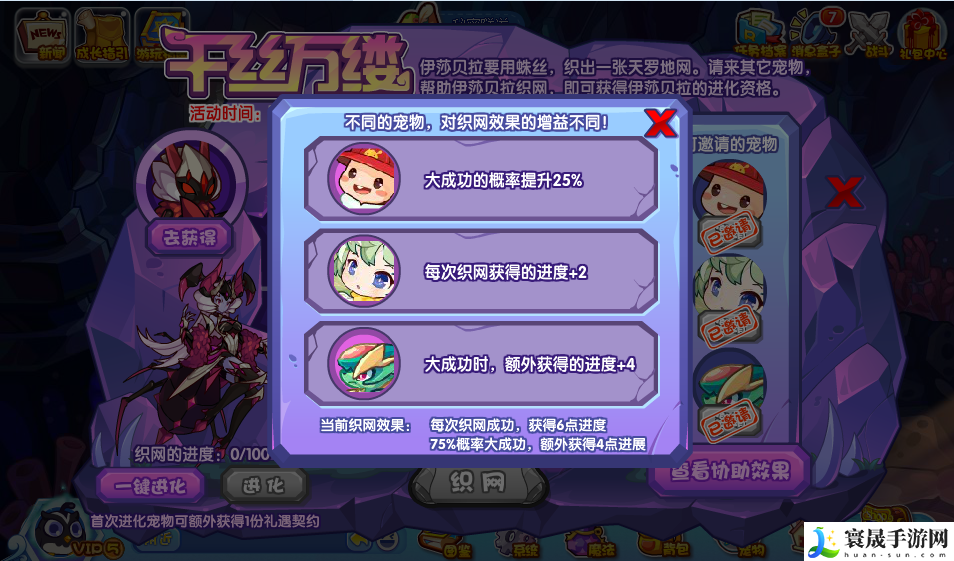 累计获得100点结网进度,就可以开启:伊莎贝拉 超进化啦!