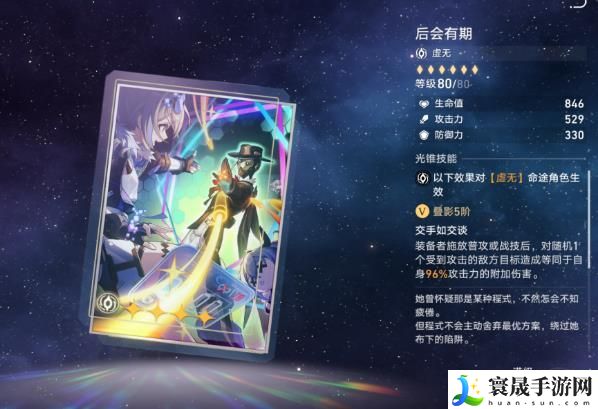 真·未来可期的光锥,精1/5能为普攻/战技提供48/96%的附加伤害,顺带一提,星穹铁道中的所有标明了属于是附加伤害的,都是可以吃到主C的增伤区和双爆加成,相当于对战技和普攻进行直接的倍率提升;提升很明显,但虚无角色里老杨比较吃效果命中所以用不到这个光锥