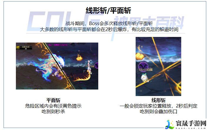 Boss连续挥动3次剑,第1/2次释放线形斩,第3次释放只有Boss周围安全的平面斩。躲避前两次线形斩时不要离Boss太远,避免吃到平面斩。