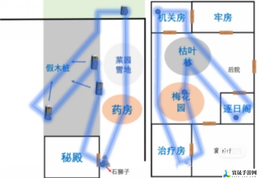 线索已知隐匿山庄其中的两个密道出入口在机关房和治疗房。再对比密道形状和密道进出口位置,可以解析隐匿山庄的密道进出口位置(如图)。因此,在隐匿山庄,五个密道进出口的位置分别在:机关房,治疗房,梅花园,枯叶林和逐日阁。(所以牢房位置,没有密道进出口)
