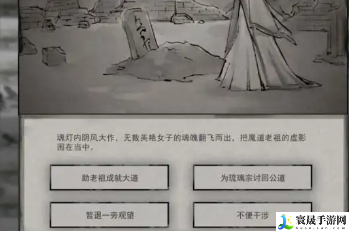 如果玩家们选择的是为琉璃宗讨回公道,那么你首先你需要打败魔道老祖,打败他之后,可以获得一张藏宝图。跟随图中的位置来到指定的地点,你将会面临两个选择,一个是前往洞中进行探索,第二个是由于魂灯熄灭,你决定到此为止。如果你选择的是到此为止,那么将会立即获得一个名字叫做玲珑灯魂的后天气运,这个气运将会让你在战斗中处于濒死状态时立刻满血满蓝满念,并且在触发一次之后消失。
