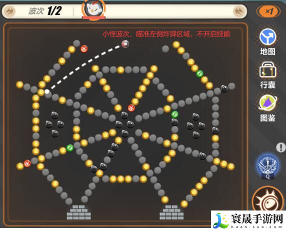 1、第一回合的小怪生命值比较低,不需要使用技能,只需注意向左侧打破易爆机关前的机关即可。