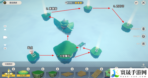 1、使用3个建造物材,将大型磐石放于起点与下方检索点连接,弹弹菇放于左上的检索点处,四叶印放于右上方两个检索点之间。