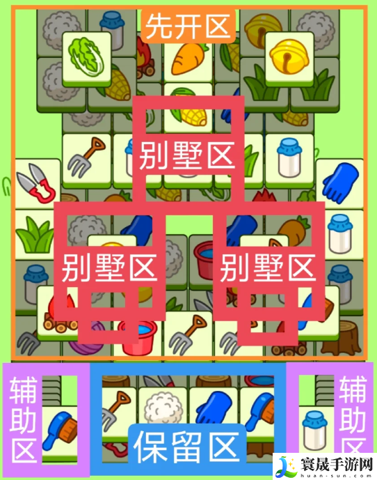 一个方型大别墅,两个3+3叠牌别墅。开局先消除橙**。然后按照一层层均匀消除表面牌。哪里压牌比较多就先消除哪里。必要时可以用盲盒区辅助消除表面牌。尽量还是以别墅区互相消除为生。蓝**有叠牌,但是不多,全部保留到后期使用。