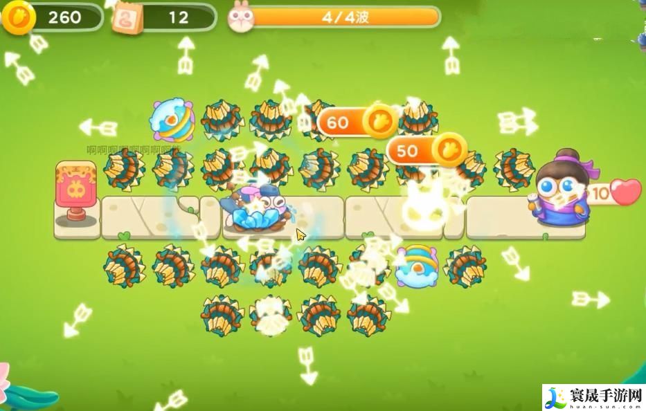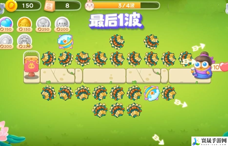 保卫萝卜4夏日垂钓第10关会给到我们保龄球或减速塔,这里橙子推荐大家使用减速塔+多重箭或乌龟的组合来打,今天的第10关大概率能刷到多重箭,所以这一关用多重箭来打