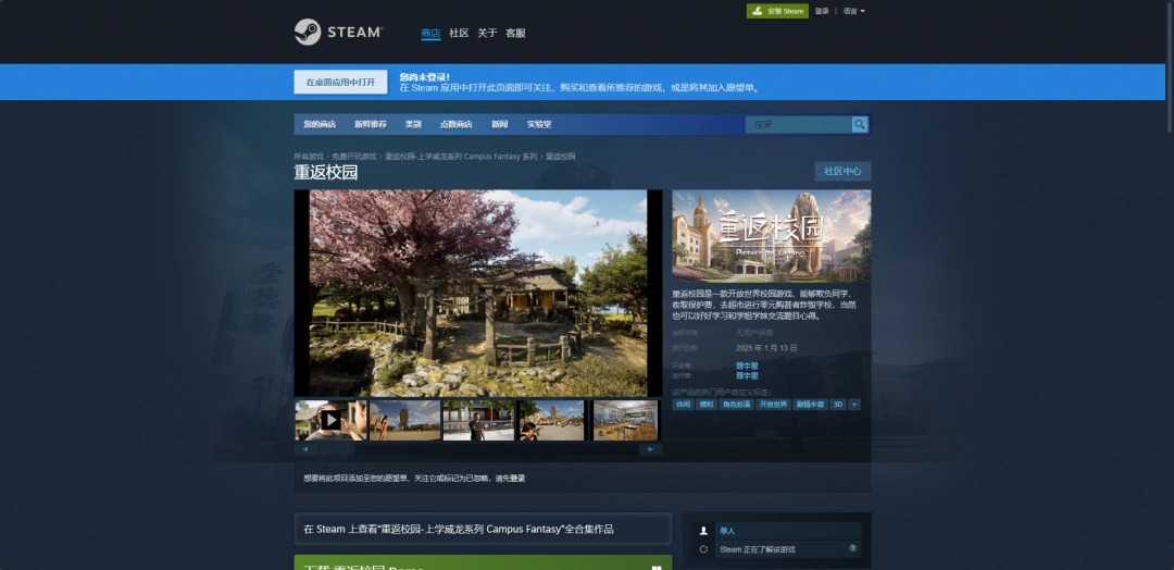 《重返校园》是一款开放世界校园游戏,而这款游戏的下载网址就是购买平台的购买页面,比如Steam版就是在购买页面购买之后,点击页面中的马上开玩就可以开始下载了。