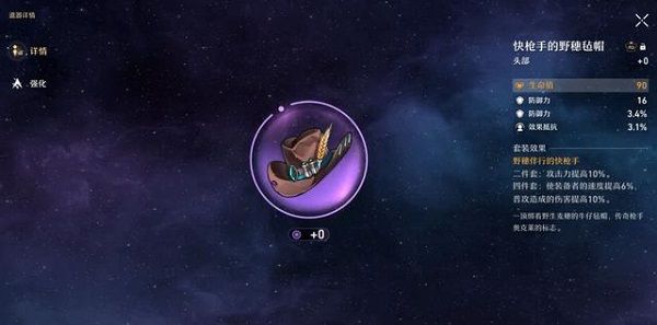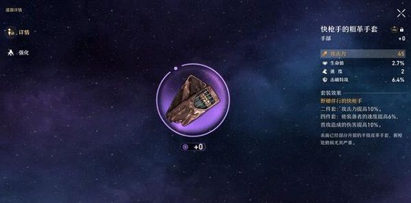快枪手2件套可以提升10%攻击力,在前期很有帮助,而头部遗器(圣遗物)的固定属性是生命值,对于前期开荒是很重要的哦。