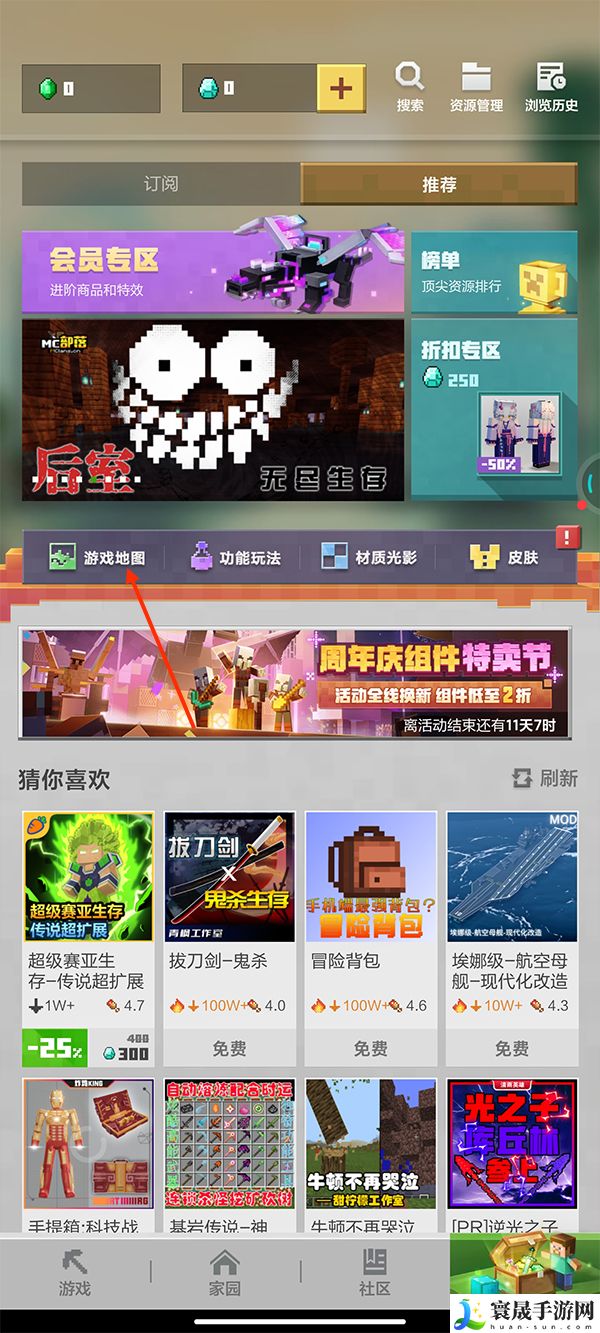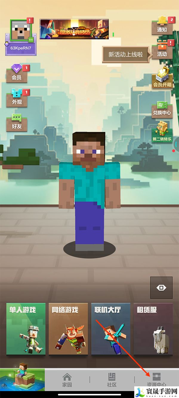 1、在我的世界首页点击下面的资源中心。