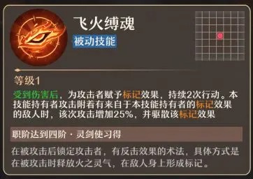 飞火缚魂(被动技能):受到上海后,为攻击者赋予标记效果,持续2次行动。本技能持有者攻击附着有来自于本技能持有者的标记效果的敌人时,该次攻击增加20%,并驱散该标记效果。